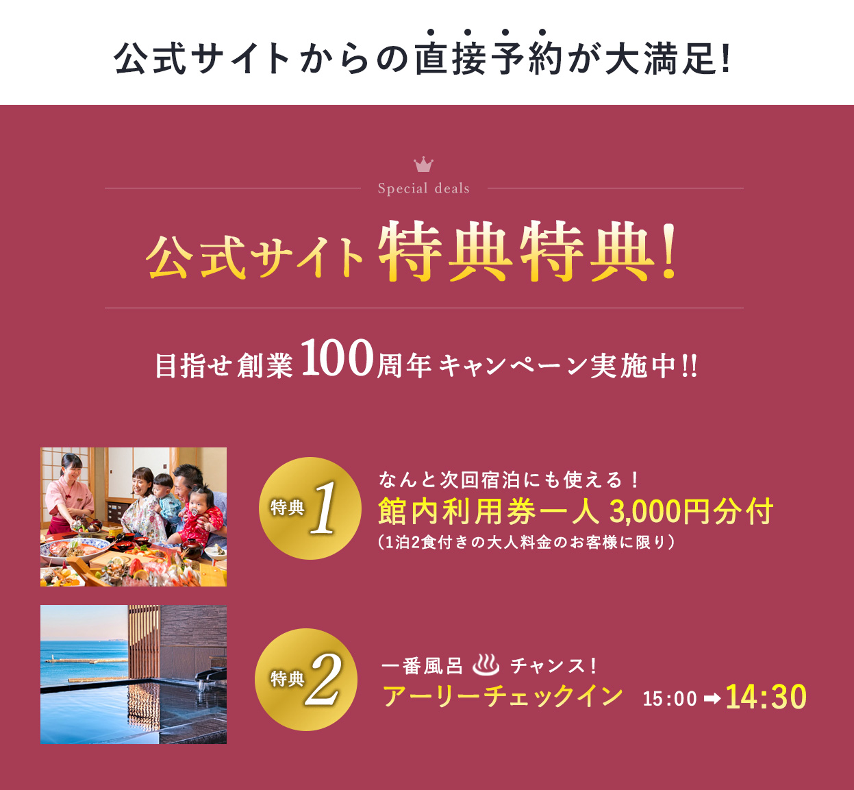 (1泊2食付きの大人料金のお客様、次回も直接予約に限り)